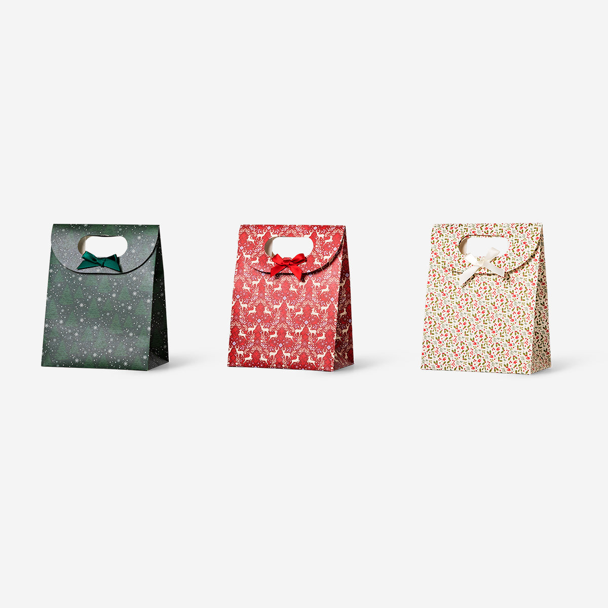 3'lü Küçük Desenli Hediye Çantası, her biri farklı yılbaşı temalı tasarıma sahip üç çantadan oluşan zarif ve pratik bir settir. 8,1 x 16,3 x 12,5 cm boyutlarındaki bu kompakt çantalar, tatlı ikramlar, küçük aksesuarlar veya yılbaşı sürprizleri gibi özel hediyeleri sunmak için mükemmeldir. Her bir çanta, canlı renkler ve mevsimsel desenlerle süslenmiş olup hediyelerinize sıcak ve neşeli bir hava katar. 1 kg’a kadar ağırlık taşıyabilen sağlam yapısı ve yerleşik sapları sayesinde hem şık hem de kullanışlı bir sunum sağlar.
