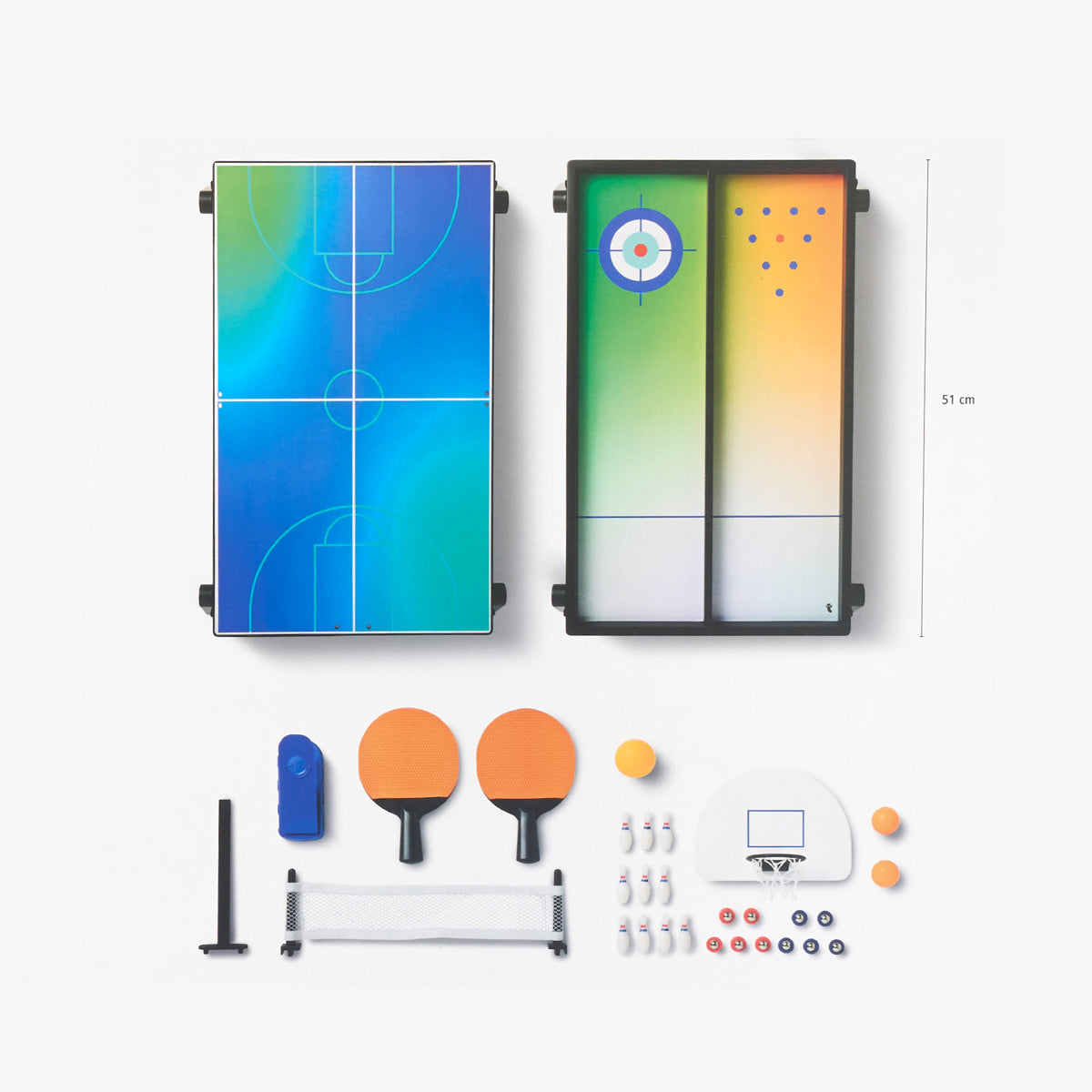 Evde arcade eğlencesini yaşatan4'ü 1 Arada Masa Oyunu, basketbol, curling, bowling ve masa tenisi için değiştirilebilir oyun tahtalarıyla geliyor. Canlı ve çok renkli tasarımı sayesinde saatlerce süren eğlenceli oyunlara imkân tanır. İster basket atışlarınızı geliştirin ister bowling labutlarını dikin, bu kompakt set aile ve arkadaşlarla rekabet dolu anlar yaşamak için idealdir.