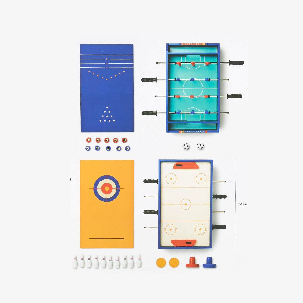Evinizde beş kat daha fazla eğlence yaşayın! Renkli tasarıma sahip bu 5’i 1 Arada Masa Oyunları 51 cm, 31 × 9,5 × 51 cm ölçüleriyle kompakt ama heyecan verici bir format sunar. Bir arada sunulan beş klasik oyun sayesinde evde keyifli vakit geçirmek veya sevdiklerinizle paylaşmak için idealdir. Masa futbolundan shuffleboard’a kadar her oyun, arkadaşlarınız ve ailenizle etkileşimli bir deneyim yaşamanıza olanak tanır.