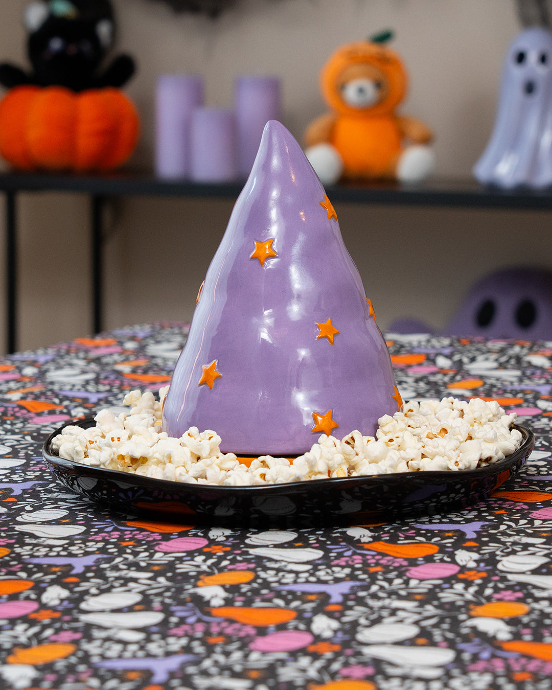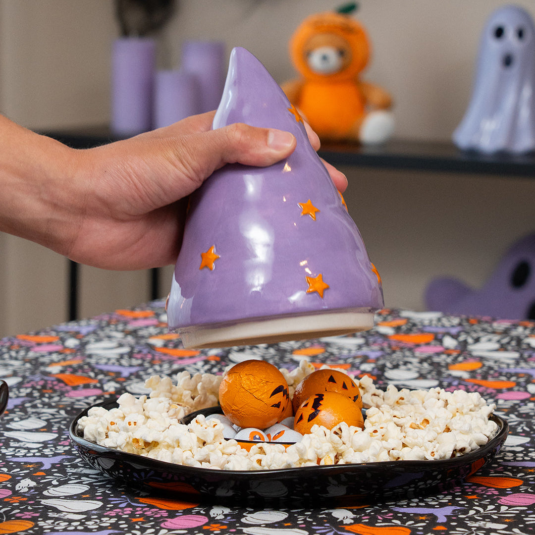 24,3 x 18,9 cm boyutlarındaki Cadı Şapkası Şeklinde Seramik Kase, kapaklı yapısıyla aynı zamanda şekerlemeleri ya da ikramları saklamaya olanak tanır. İster masa ortasında dekoratif bir parça olarak ister partilerde misafirlere servis sunumunda kullanılsın, Halloween kutlamalarınıza özgün bir karakter katar. Eğlenceli tasarımıyla mutfağınıza büyüleyici bir stil kazandırırken, pratik kullanımıyla da mevsimsel sofralarınızı tamamlar.