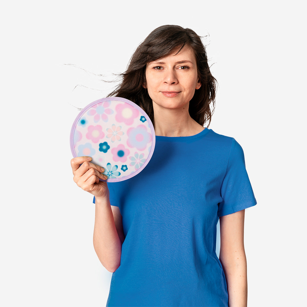 Çiçek Desenli Açılan Yelpaze çıtçıt düğmeli mekanizması sayesinde düzenli bir şekilde açılır ve kolayca kapağına geri katlanır. Bu pratik tasarım, seyahatlerde, açık hava etkinliklerinde veya günlük kullanımda rahatlık sunar. Parlak çiçekli görünümü, yazlık stilinize sevimli ve eğlenceli bir detay ekler. Her kullanımda günlük rutine hafiflik, renk ve çiçek açan bir enerji katar.