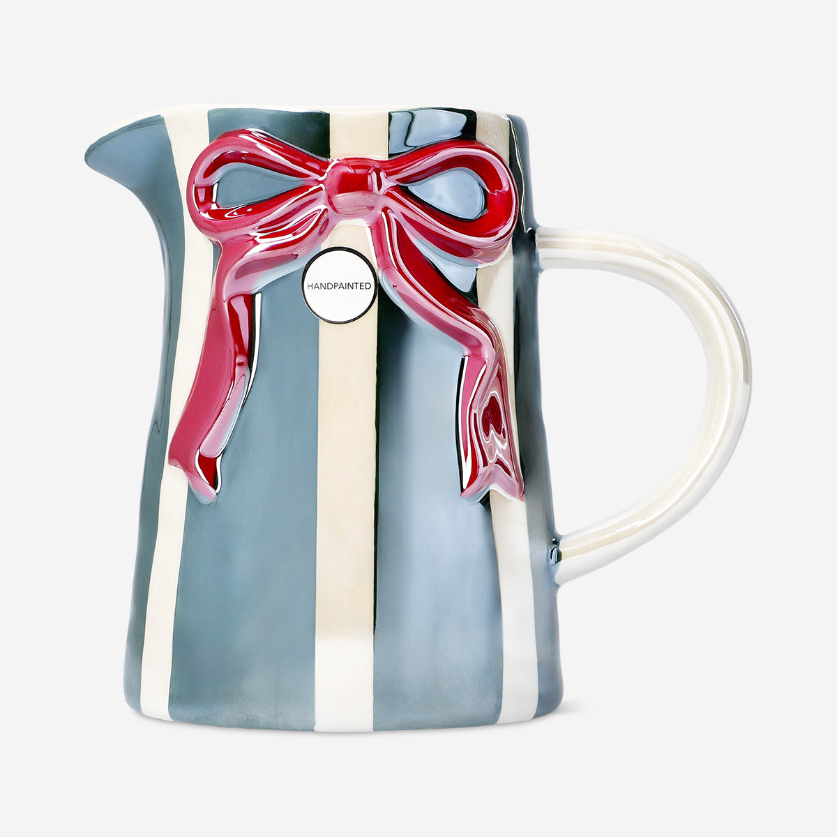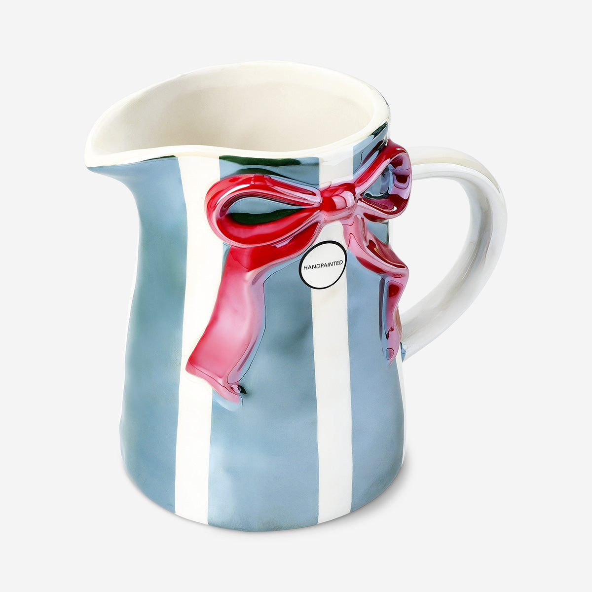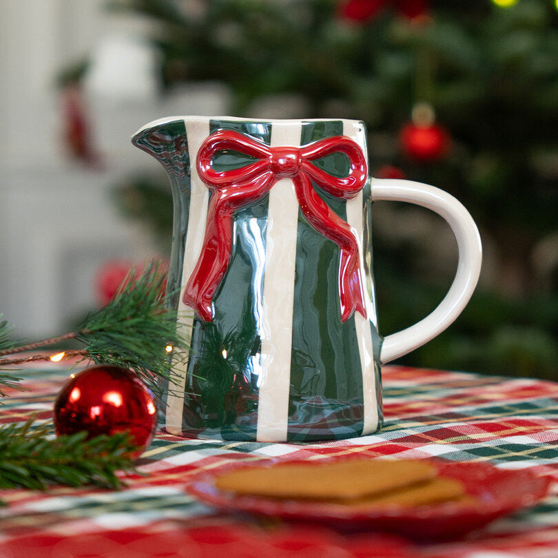 12,4 x 19,3 x 21,5 cm boyutlarındaki Fiyonk Detaylı Yeşil Çizgili Sürahi, dayanıklı seramik malzemeden üretilmiştir ve gıda kullanımına uygundur. Yumuşak hatları ve detaylı işçiliğiyle hem bayram kutlamalarında hem de günlük sofralarda dikkat çeker. El yapımı hissi veren yüzeyi, her sunuma zarif bir karakter kazandırır. Bu sevimli ve eğlenceli sürahi, yılbaşı ruhunu sofralarınıza taşırken işlevselliğiyle de öne çıkar.