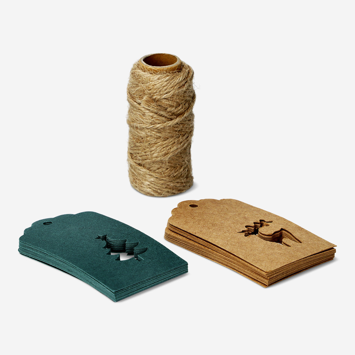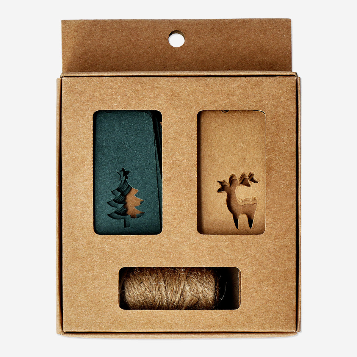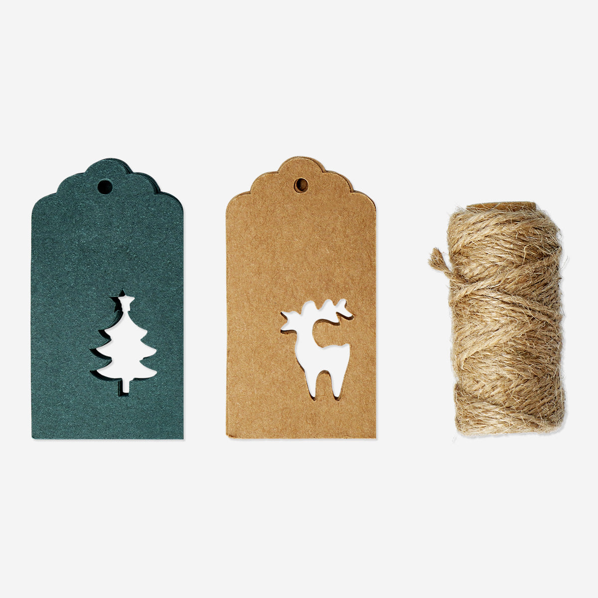 Yılbaşı ve diğer özel günlerde hediye paketlerinizi Hediye Dekorasyon Seti ile süsleyebilirsiniz. Set, 28 adet şık kesilmiş tasarımlara sahip hediye etiketi ve 10 metre uzunluğunda jüt iplikten oluşmaktadır. Etiketler, kişisel mesajlarınızı eklemek için ideal olan 7.5 x 4 cm boyutunda kağıttan üretilmiştir.