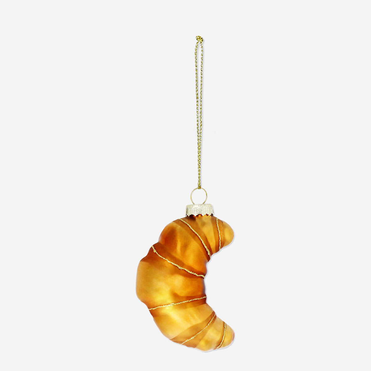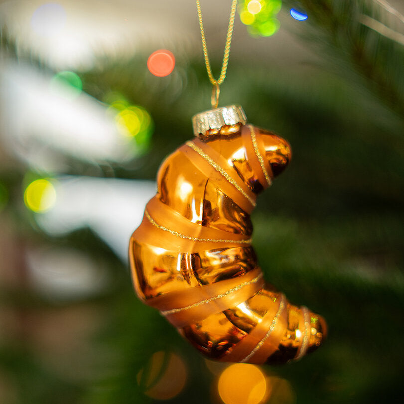 Kruvasan Yılbaşı Ağacı Süsü, Fransız pastanelerinin cazibesini Noel ruhuyla buluşturan eğlenceli ve özgün bir parçadır. 3,3 x 8,5 x 5,3 cm boyutlarındaki bu cam süs, taze pişmiş bir kruvasanın altın rengi katmanlarını gerçeğe yakın bir şekilde yansıtır. Yumuşak parlaklığı ve detaylı yüzey dokusu, ağacınıza sıcaklık ve tatlı bir sofistike hava kazandırır. Hafif yapısı sayesinde dallara, çelenklere veya mutfak temalı dekorasyonlara kolayca asılabilir.