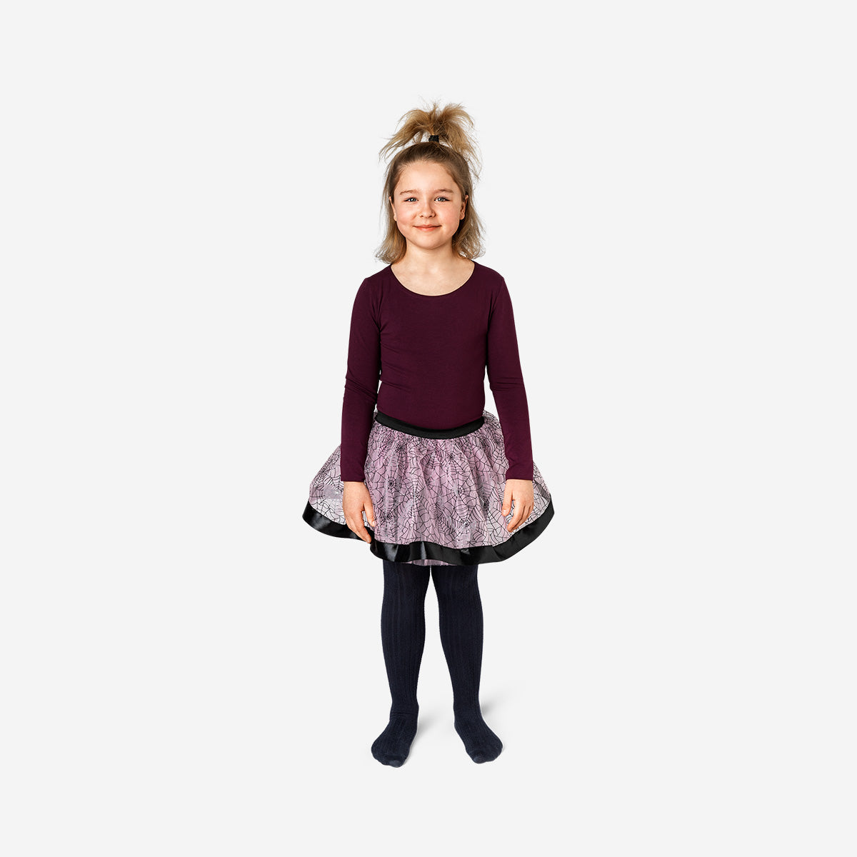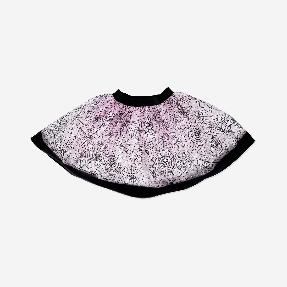 Pembe Örümcek Ağı Desenli Çocuk Eteği, 4 ila 8 yaş arası çocuklar için tasarlanmış sevimli ve büyüleyici bir kostüm parçasıdır. Yumuşak polyesterden üretilen bu etek, narin pembe zemin üzerine işlenmiş siyah örümcek ağı desenleriyle dikkat çekerken, siyah saten süslemelerle şıklığını tamamlar. 67,5 x 34 cm ölçülerindeki etek, rahat kesimi sayesinde hareket özgürlüğü sunar ve şeker toplama, okul etkinlikleri veya Halloween partileri için idealdir.