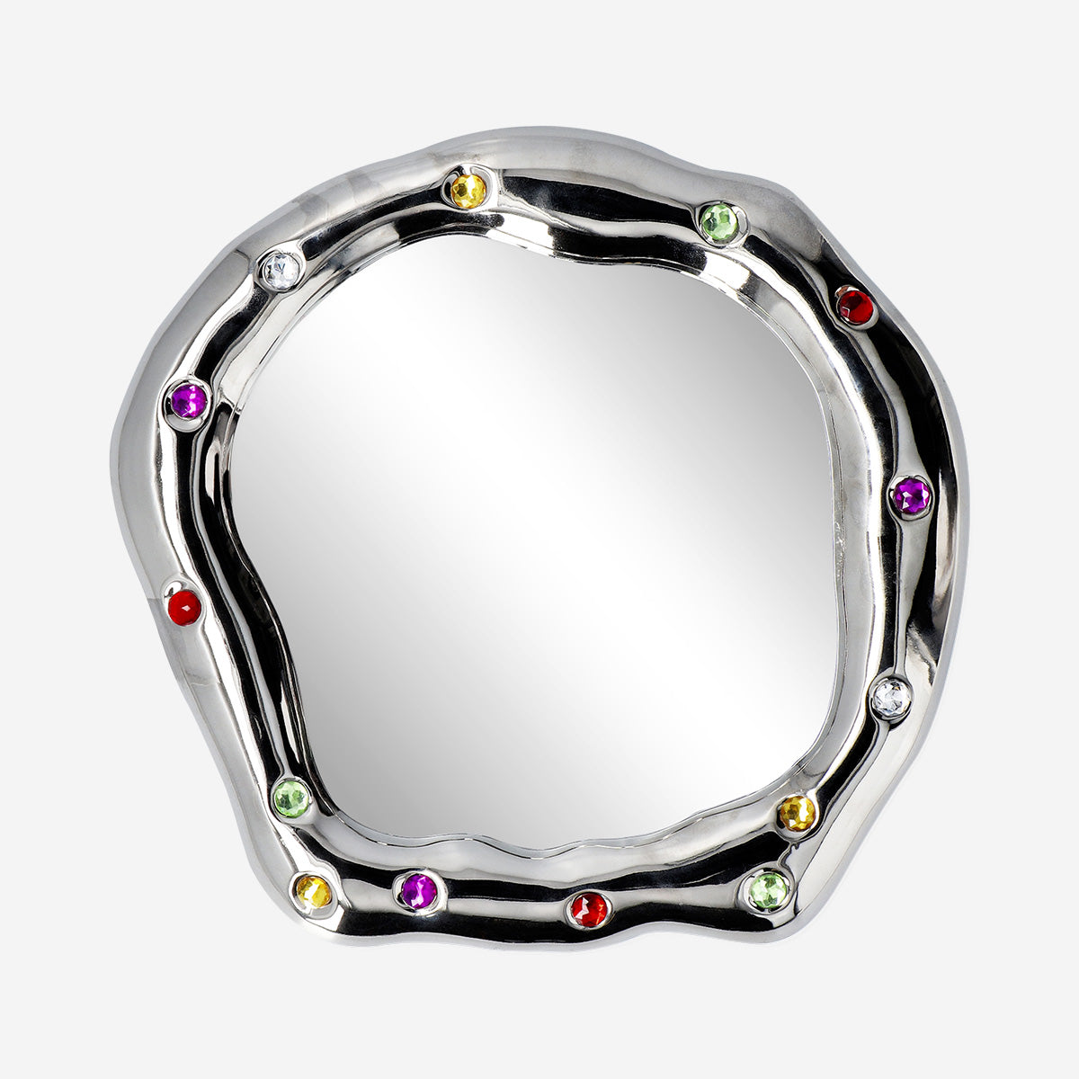 Duvar dekoruna ışıltı katmak ister misin? Bu renkli taşlı gümüş seramik ayna, zarafetle eğlenceli detayları bir araya getiriyor. Dalgalı formdaki çerçevesi sayesinde yuvarlak hatlara yumuşak bir görünüm kazandıran bu ayna, bulunduğu ortama modern bir parıltı ekliyor.