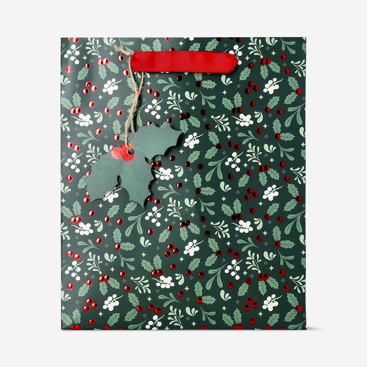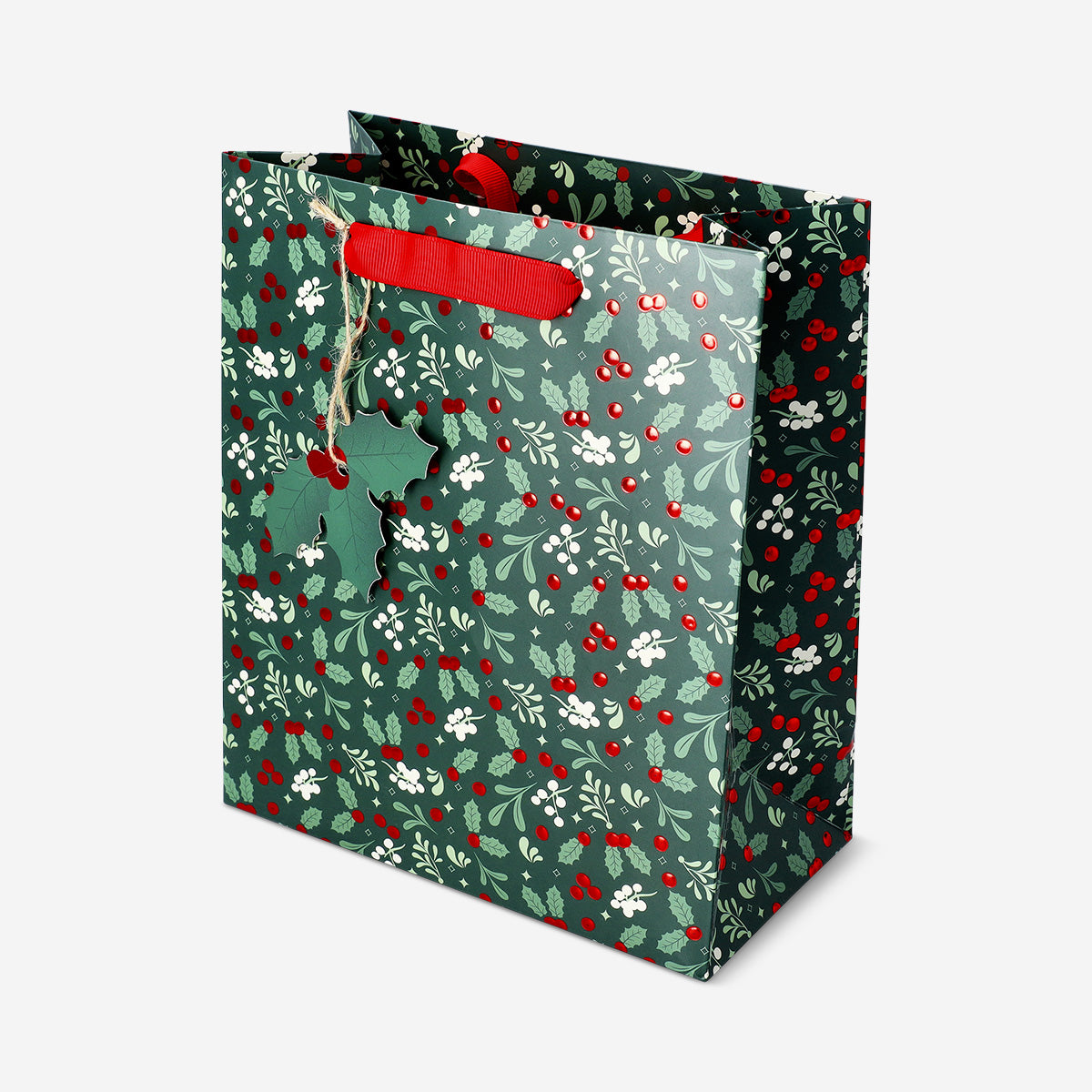 Yılbaşı Bitkisi Desenli Yeşil Hediye Çantası, zarif kabartmalı çobanpüskülü baskısı ve kırmızı folyo detaylarıyla dikkat çeker. 10 x 23 x 19,5 cm boyutlarındaki bu kağıt çanta, orta boy hediyeler ve tatil ikramları için mükemmel bir seçimdir. Parlak yeşil zemin üzerinde yer alan kırmızı meyve detayları, dokulu yüzeyle birleşerek çantaya şık ve geleneksel bir görünüm kazandırır. Yılbaşı temalı hediye sunumlarınıza klasik bir ışıltı katan bu tasarım, özenli paketlemeyi sevenler için ideal bir tercihtir.