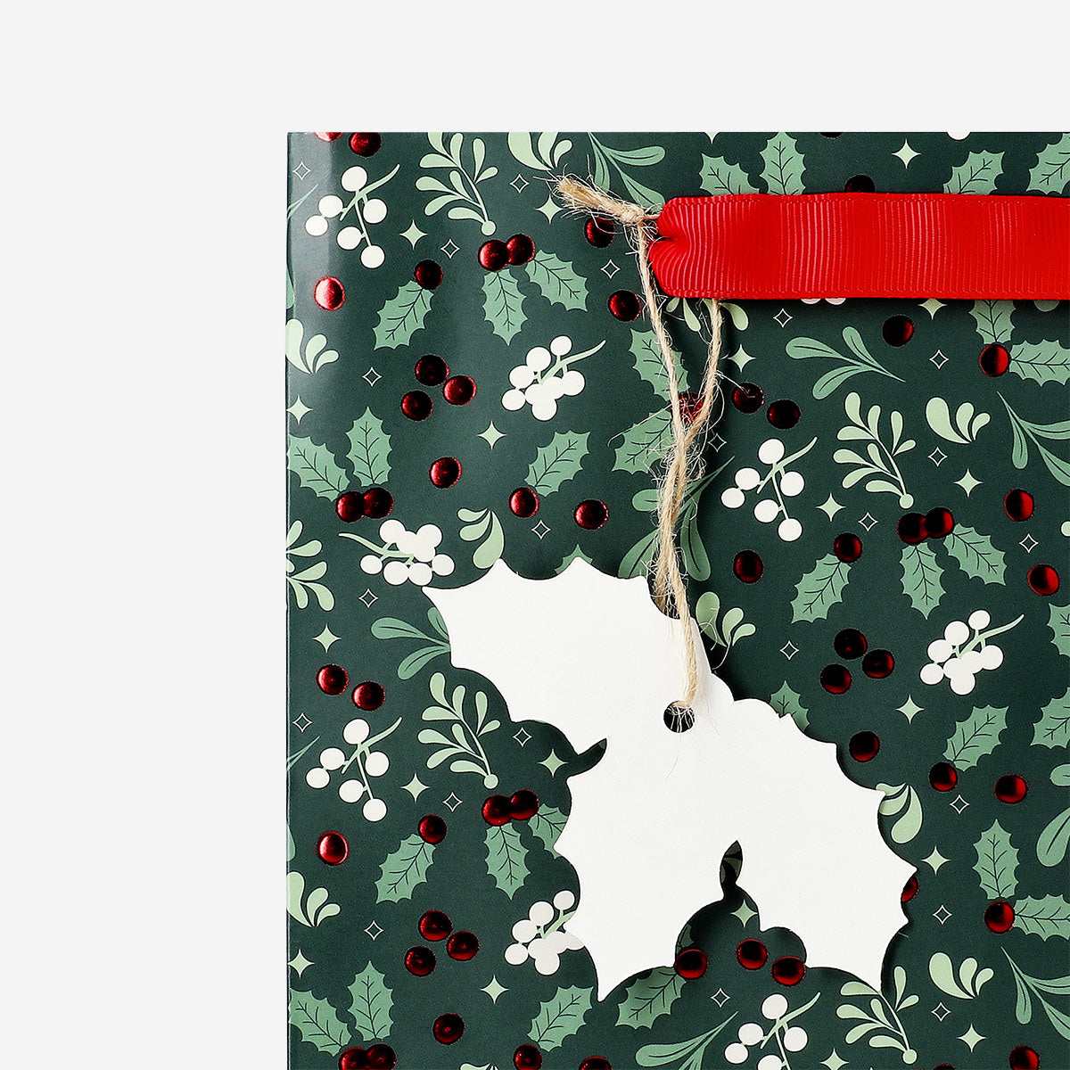 Yılbaşı Bitkisi Desenli Yeşil Hediye Çantası, kırmızı saten şerit kulplar ve uyumlu çobanpüskülü şeklinde etiketle tamamlanarak bütüncül bir görünüm sunar. Sağlam yapısı sayesinde hediyelerinizi güvenle taşırken, folyo detayları sayesinde ışıkta parlayarak göz alıcı bir etki yaratır. Hem estetik hem de işlevsel olan bu çanta, yeni yıl kutlamaları, aile hediyeleri veya özel yıl sonu sürprizleri için mükemmeldir. Mevsimsel zarafeti ve geleneksel yılbaşı renklerini bir araya getirerek, hediyelerinizi sunmanın en şık yollarından birini sunar.