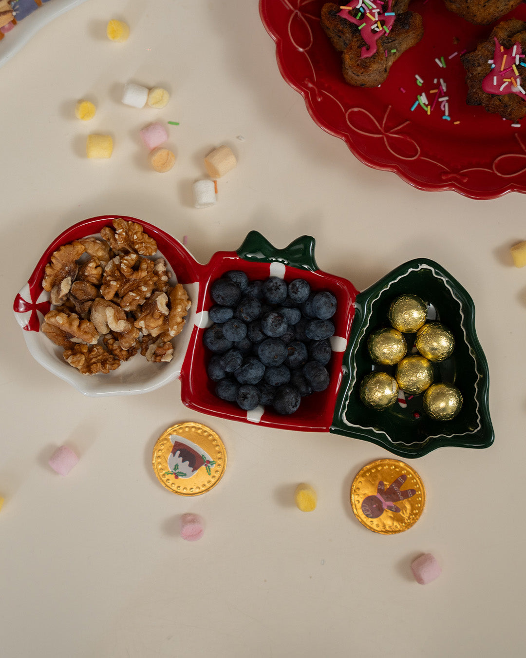 Bu çok renkli yılbaşı temalı servis kasesi ile yılbaşı davetlerinize neşeli bir dokunuş katabilirsiniz. Seramikten üretilen bu eşsiz tepsi, her biri farklı bir yılbaşı tasarımına sahip üç ayrı kaseden oluşur: Noel Baba, yılbaşı ağacı ve hediye. 27,4 x 4,4 x 11 cm ölçülerindeki bu servis kasesi, atıştırmalıklar, tatlılar veya soslar için mükemmeldir ve sofralarınıza şıklık katacak harika bir detaydır.